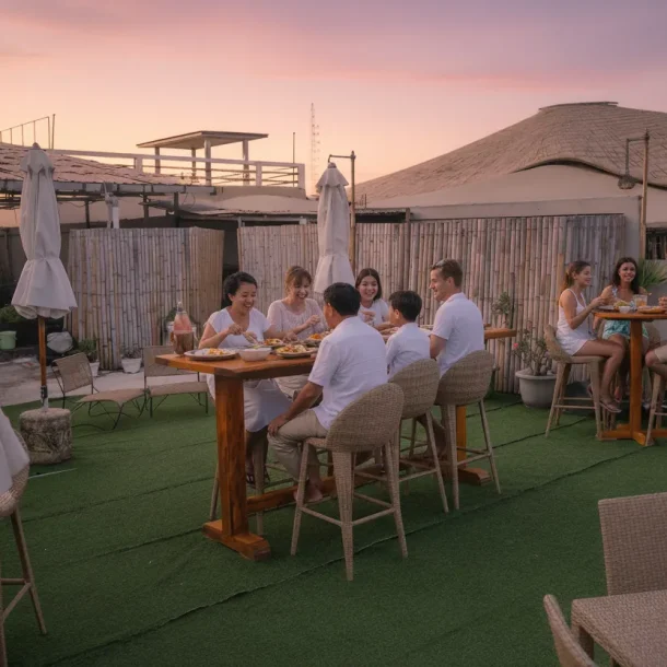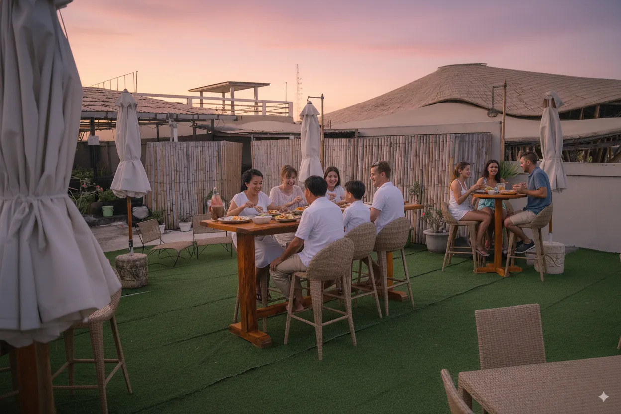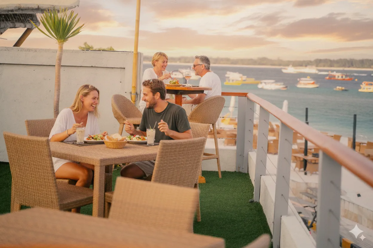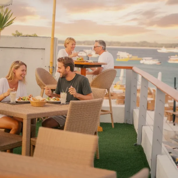 Set just above our beachfront restaurant, the Rooftop Sunset Terrace is one of the best-kept secrets on Gili T. From this elevated perch you’ll enjoy uninterrupted views of the ocean, the golden glow of the sunset, and the lively island scene unfolding below.